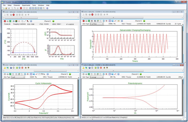 EIS module (10uHz~1MHz) is equipped all 4 channels. Each channel potential control range is ±10V, current control range ±1A, can meet experiment requirement for most people.