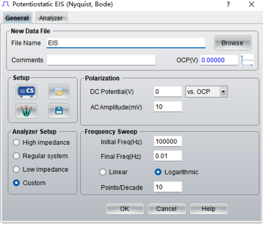 Choose the technique “Potentiostatic EIS”. After OCP is stable, run it with the parameters set as below: