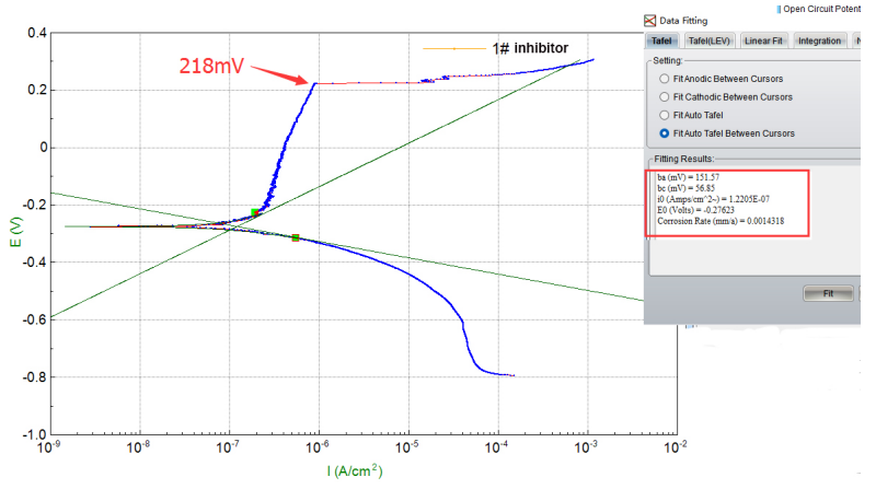Fig 9. Tafel fitting result for 45# steel in inhibitor #1