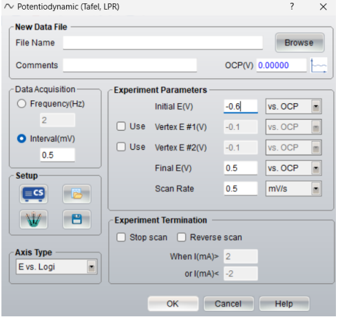 Choose the technique “Potentiodynamic”. Potential sweeps from -0.6 to 0.5V vs. OCP, and the scan rate is 0.5 mV/s.