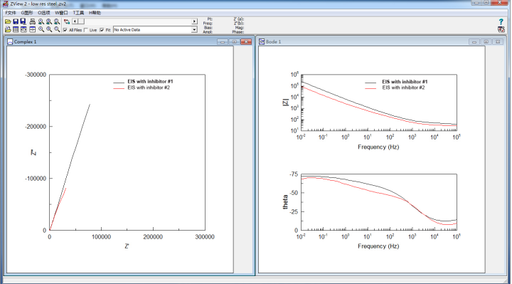 The diameter of the capacitance arc of system with inhibitor #1 and modulus are larger, and the Rp value after fitting will also be larger. According to icorr=B/Rp, (where B is the constant Stern coefficient), we know that the corrosion current density of the specimen in inhibitor #1 is lower, indicating that inhibitor #1 has better inhibiting effect than inhibitor #2 for the specimen.